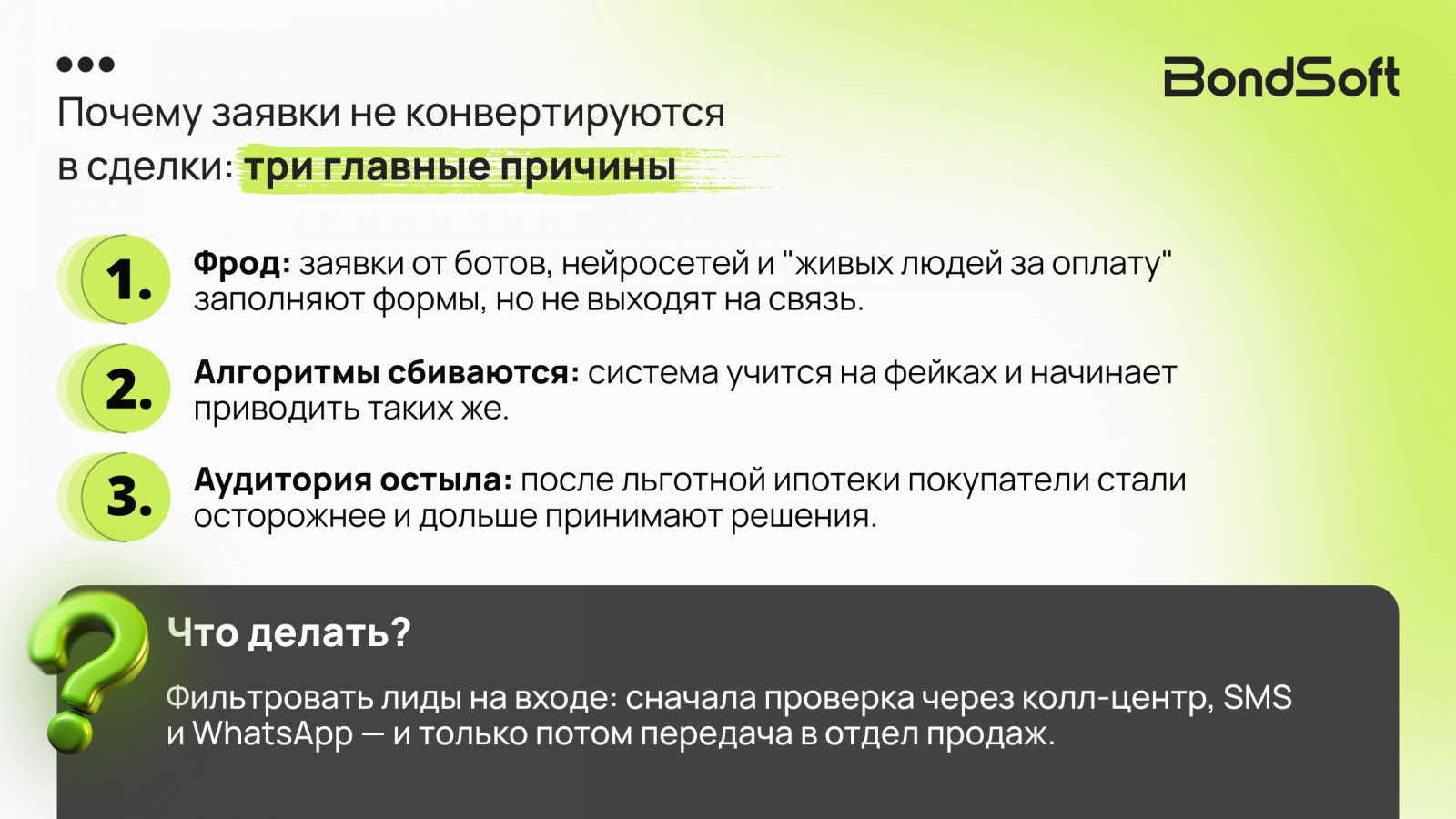 Первая причина — это фрод. На рынке появились боты, автозаполненные заявки за оплату и нейросетевые автоответчики. «Мы фиксировали всплески “пустых” лидов, особенно после квизов. Форму заполнили — а на звонки не отвечают», — рассказывает Денис Костенко, руководитель департамента маркетинга в ГК «ДОННЕФТЕСТРОЙ» (Ростов-на-Дону).