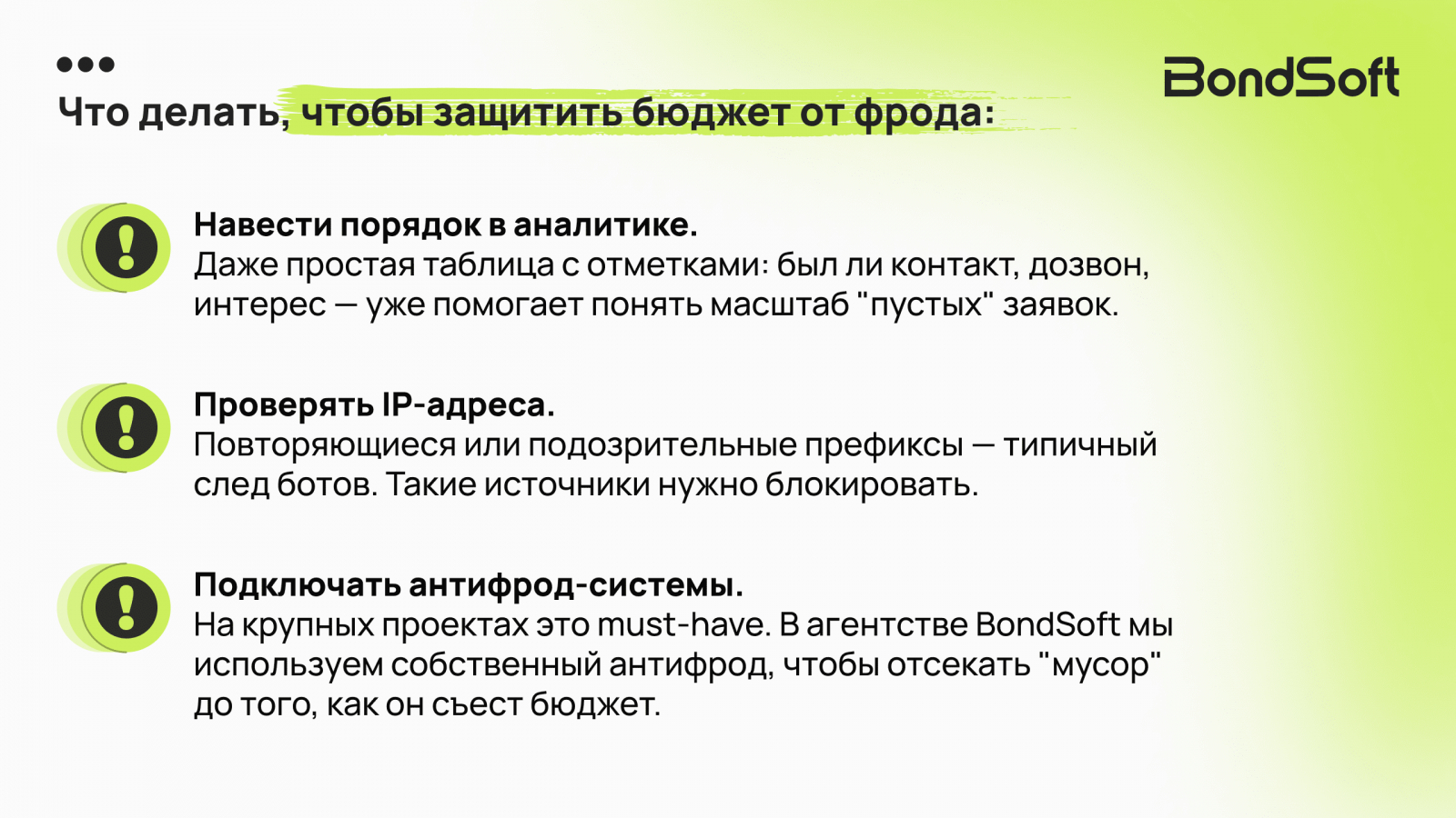 На крупных проектах часто подключают антифрод-системы. «Мы протестировали несколько антифрод-инструментов в течение 2024 года: часть оказалась неэффективной, но некоторые дали хорошие результаты», — делится Денис Костенко из ГК «ДОННЕФТЕСТРОЙ». В агентстве BondSoft мы используем антифрод собственной разработки, чтобы оперативно блокировать "мусорные" источники до того, как они съедят бюджет.
