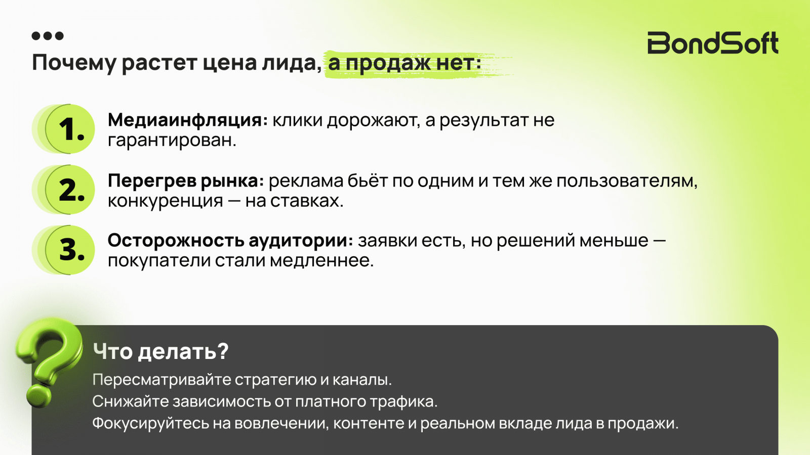 Пересмотрите стратегию, оптимизируйте каналы, снижайте зависимость от платного трафика, фокусируйтесь на вовлечении и удержании через контент. Оценка эффективности должна базироваться на качестве заявки и реальном вкладе в продажи — только так можно адаптироваться к новым условиям и сохранить рентабельность.