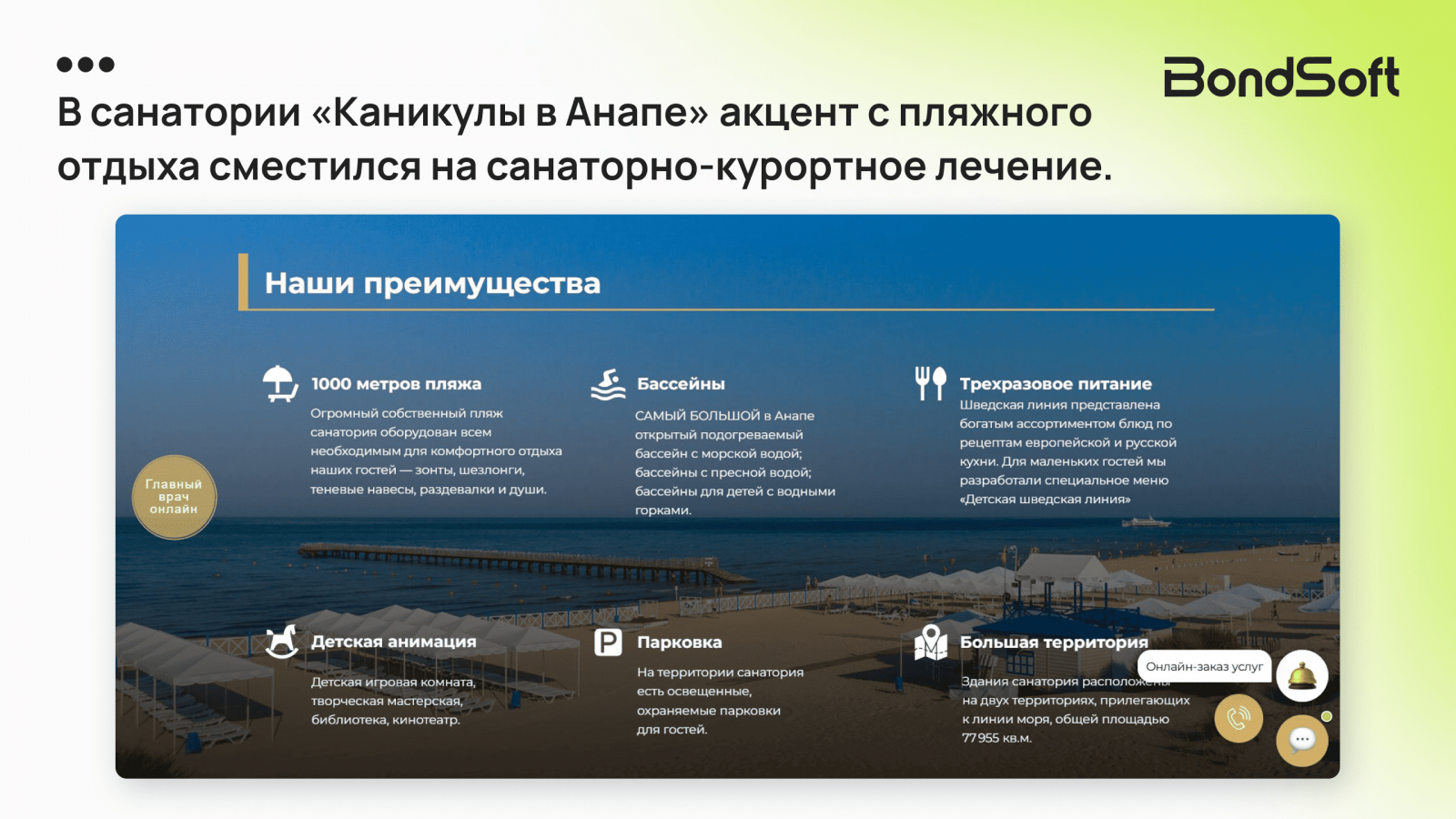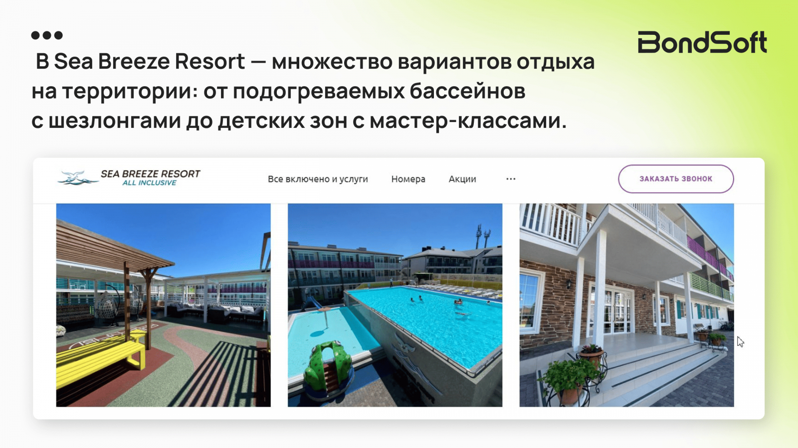 Не забывайте и про SEO-оптимизацию. Работа по SEO не дает моментального результата — на формирование устойчивых позиций в поисковых системах уходят месяцы, поэтому начинать нужно как можно раньше, чтобы не потерять ни одного драгоценного дня сезона и быть на виду у тех, кто прямо сейчас ищет альтернативу пляжному отдыху.