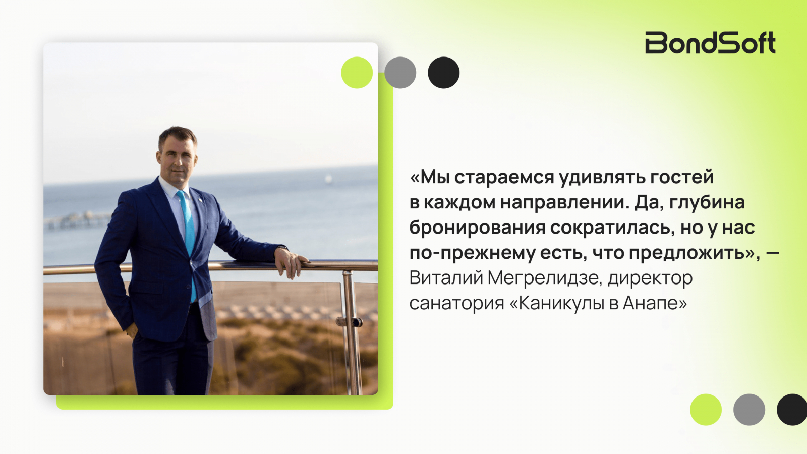 Санаторий «Каникулы в Анапе» тоже перестраивает концепцию: пляж — уже не главная приманка. «Мы сместили акценты с пляжного отдыха на санаторно-курортное лечение: у нас есть крытый бассейн, медицинский центр, прокат велосипедов, экскурсионное бюро. Также проводим бесплатные обзорные экскурсии и надеемся перенести этот формат на лето. Плюс, конечно, солнечные ванны никто не отменял», — рассказывает Виталий Мегрелидзе, директор санатория «Каникулы в Анапе».