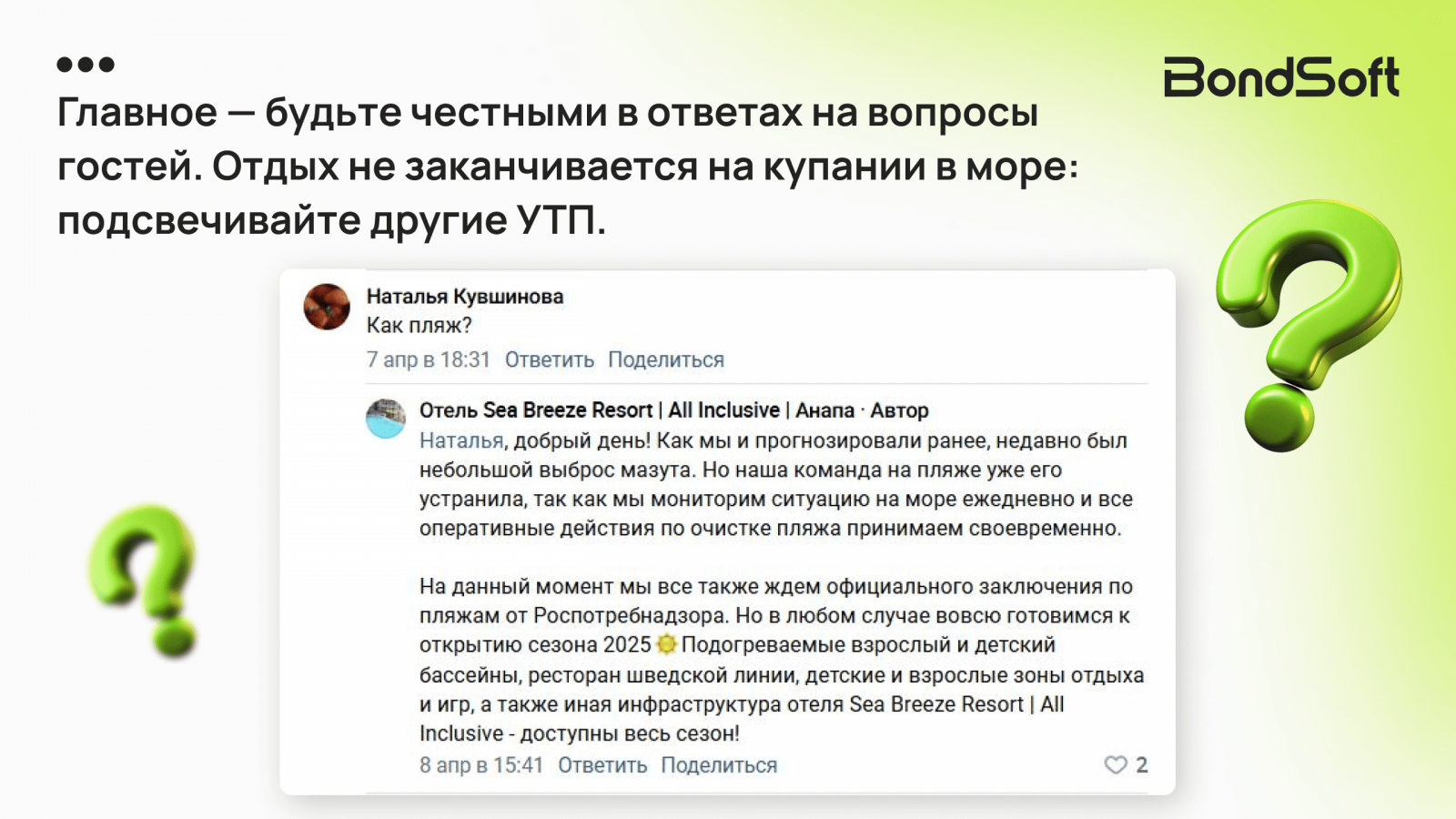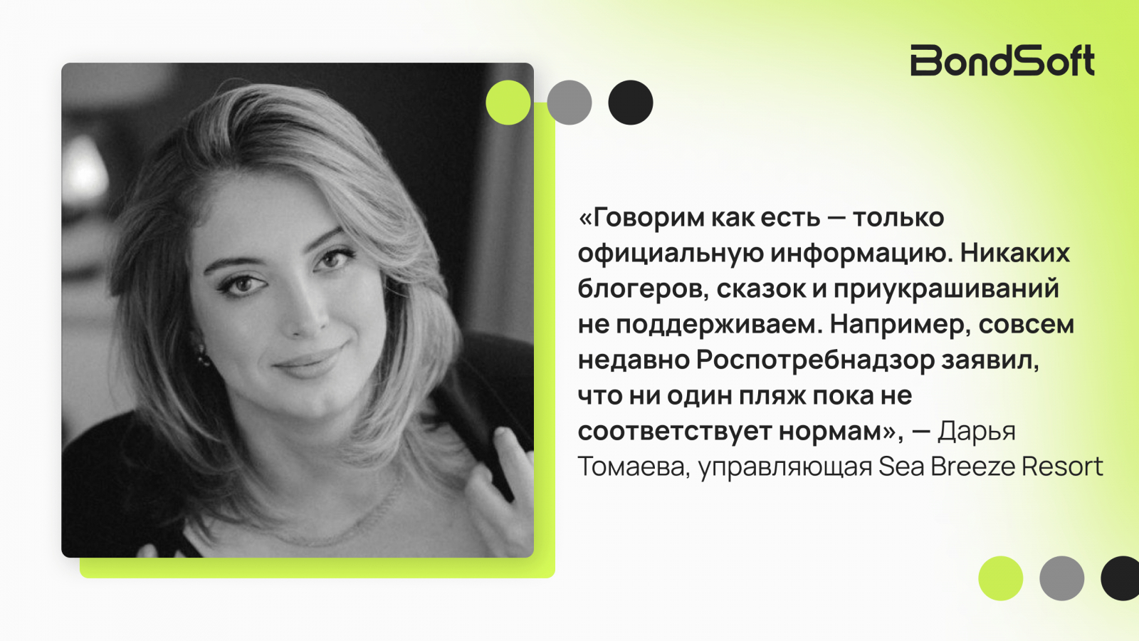 В Sea Breeze Resort не пытаются сгладить углы: «Говорим как есть — только официальную информацию. Никаких блогеров, сказок и приукрашиваний не поддерживаем. Например, совсем недавно Роспотребнадзор заявил, что ни один пляж пока не соответствует нормам», — рассказывает Дарья Томаева.