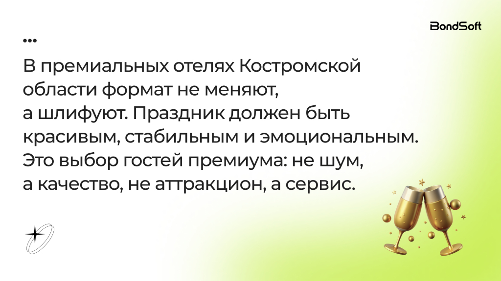 Новогодний праздник перестает быть событием «по привычке». Его собирают как продукт — с логикой, идеей, экономикой и собственным стилем. И те, кто делает это честно и заранее, получают не просто высокую загрузку, а благодарного гостя, который возвращается.