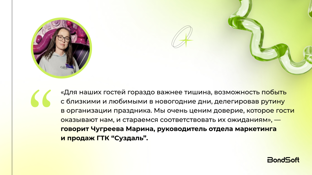 «ГТК Суздаль имеет очень удобную инфраструктуру для организации корпоративных мероприятий. Мы традиционно являемся площадкой, принимающей корпоративные группы по разным поводам, и, в том числе — новогодние корпоративы.. Пик частных бронирований на Новый год в последние годы сместился ближе к ноябрю–декабрю. Мы подстраиваем корпоративные заезды заранее и разделяем эти форматы», — Марина Чугреева, руководитель отдела маркетинга и продаж ГТК “Суздаль”.