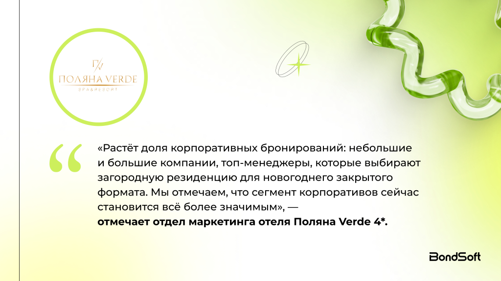 «В нашем случае доминируют частные гости: семьи, пары, компании друзей, которые хотят провести праздник в формате отдыха, без суеты города. Однако растёт доля корпоративных бронирований: небольшие и большие компании, топ-менеджеры, которые выбирают загородную резиденцию для новогоднего закрытого формата. Мы отмечаем, что сегмент корпоративов сейчас становится всё более значимым», — команда Поляна Verde 4*.