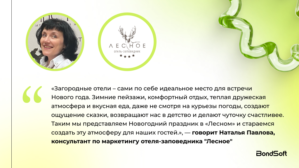 Мы поговорили с представителями загородных отелей, чтобы увидеть, как Новый год встречают в разных регионах. Главное: у каждого формата — свой гость, своё настроение и свой маркетинговый подход. Именно это разнообразие создаёт ранний спрос и помогает заполнять даты ещё до декабря.