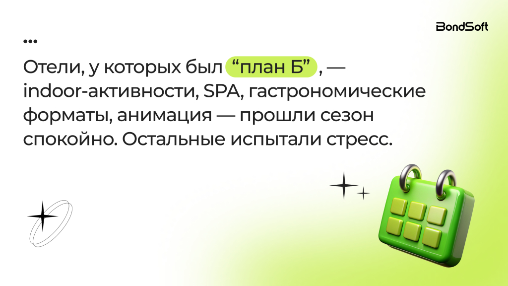На первый взгляд это кажется преждевременным, но практика показывает обратное: именно в сентябре приходят самые осознанные гости, те, кто выбирает отдых не по акциям, а по содержанию. Они формируют основу загрузки на Новый год. Если упустить этот сегмент, дальше остаётся работать главным образом по скидочным механикам.