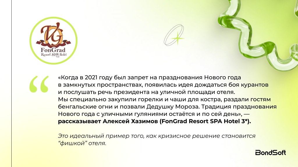 Показательный пример — FonGrad Resort SPA Hotel 3*. Их уличный формат празднования родился как вынужденная мера в пандемию, но стал фирменной традицией.