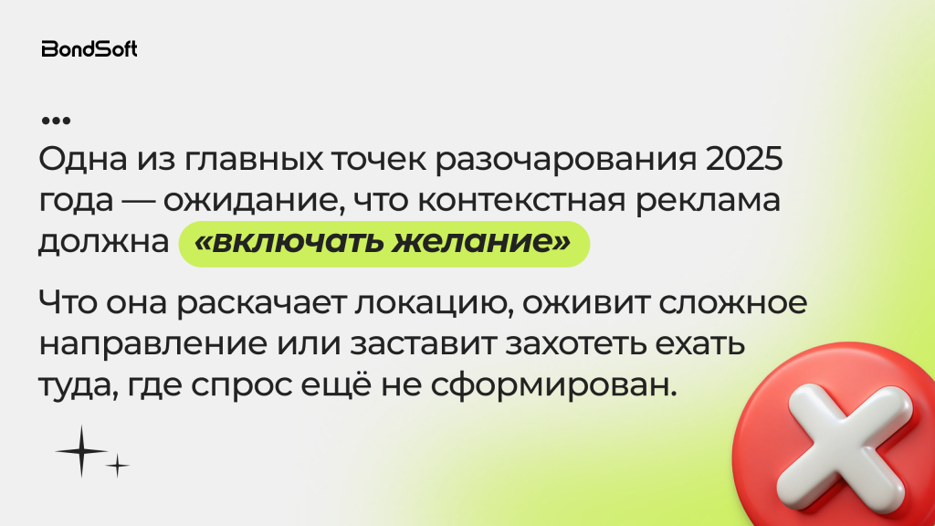 Одна из главных точек разочарования 2025 года — ожидание, что контекстная реклама должна «включать желание». Что она раскачает локацию, оживит сложное направление или заставит захотеть ехать туда, где спрос ещё не сформирован.