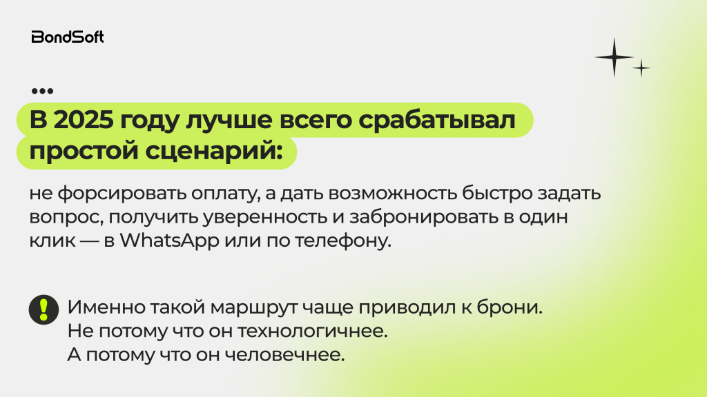 Формулировка «Забронировать в WhatsApp» работала заметно лучше, чем нейтральные кнопки «написать» или «узнать подробнее». Она сразу задаёт правильное ожидание.