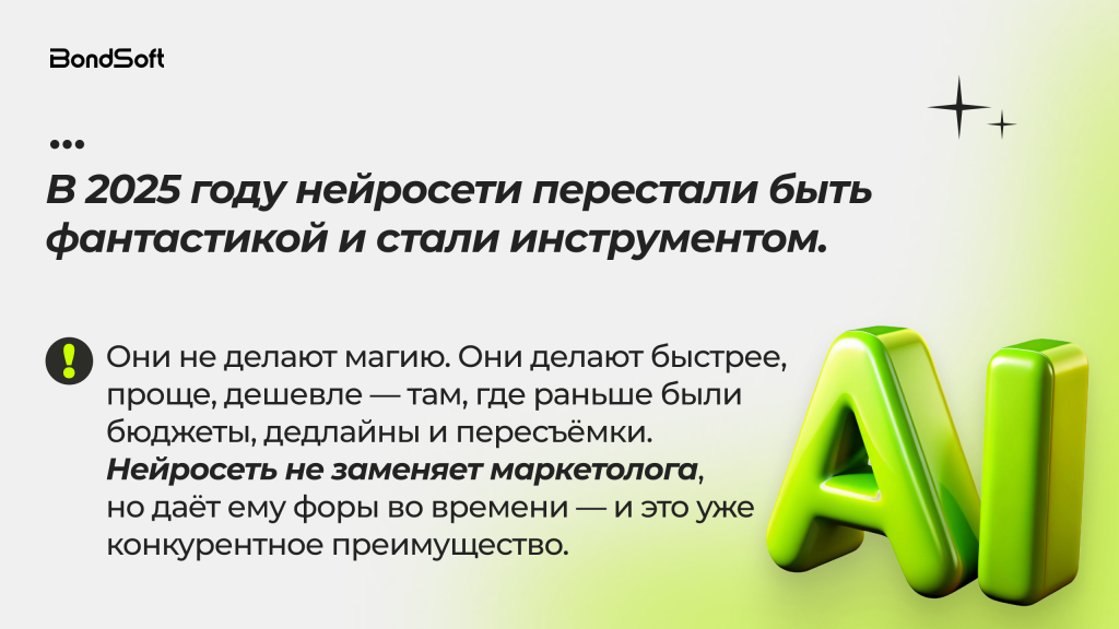 Нейросети не заменили людей, не отменили сервис и не сделали маркетинг «автоматическим». Зато они сильно упростили и ускорили работу там, где раньше уходили недели и бюджеты.