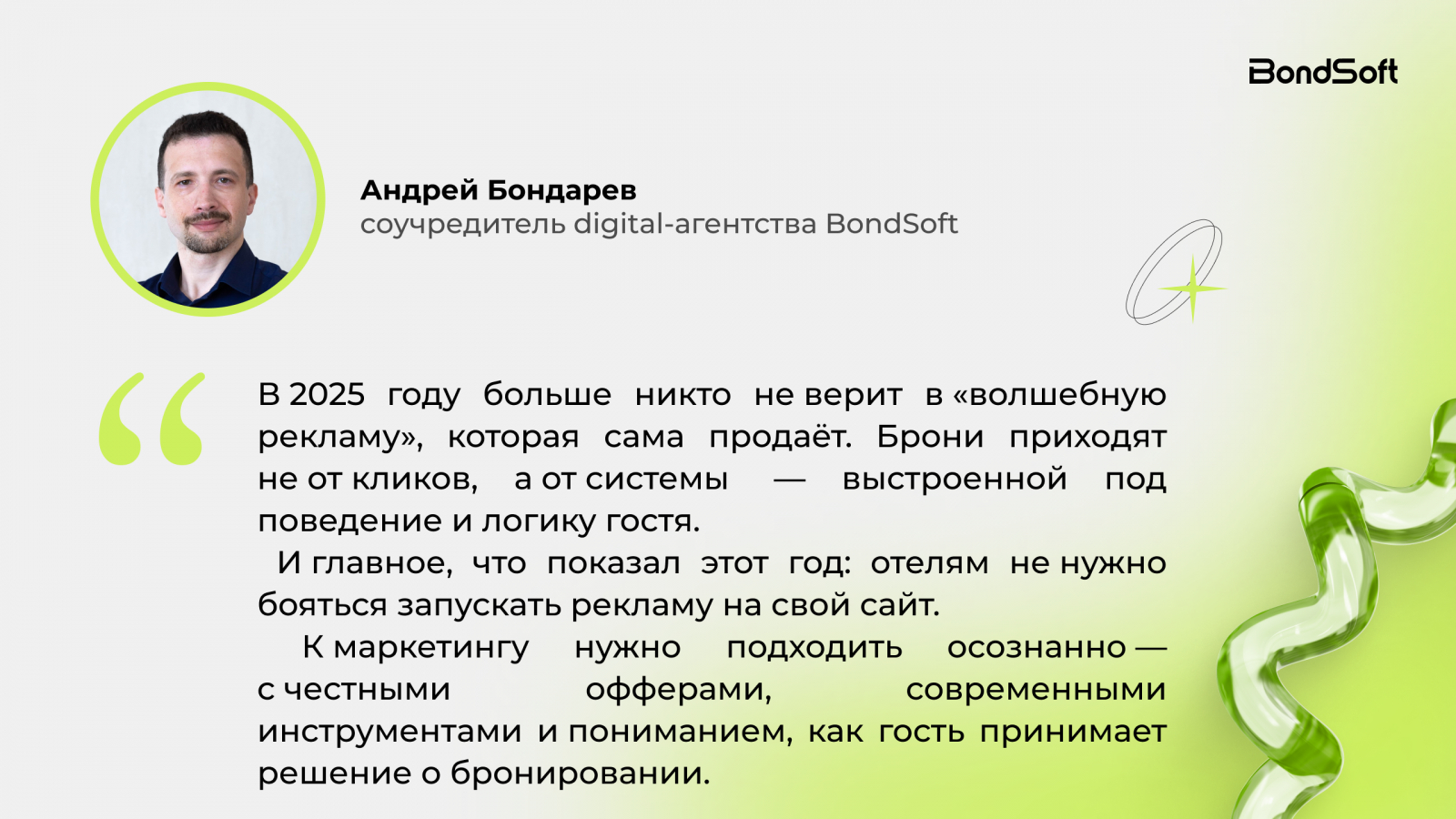 И именно это понимание в 2025 году стало главным конкурентным преимуществом отелей. Не бюджеты. Не форматы. Не технологии. А способность выстроить маркетинг так, как гость действительно принимает решения.