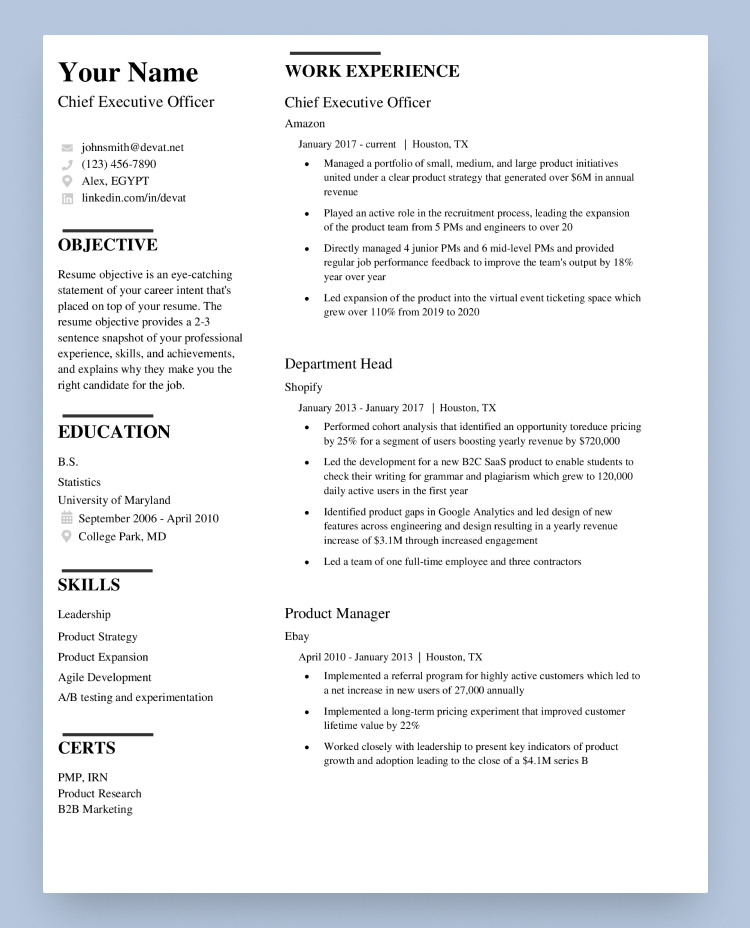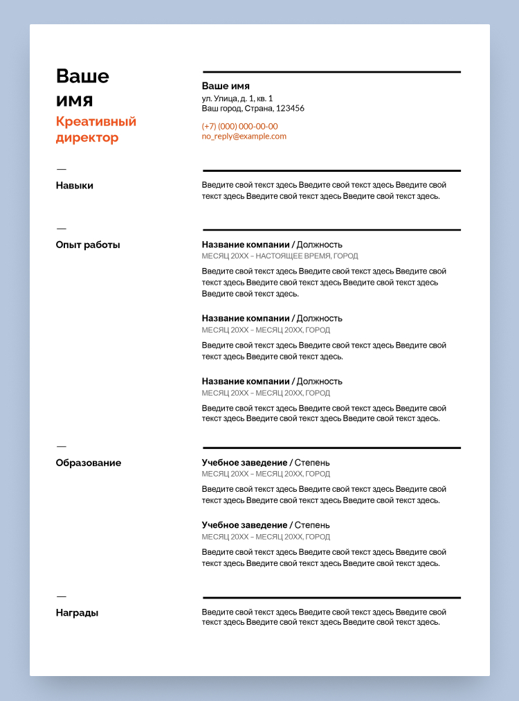 Оформление резюме на позицию руководителя должно выглядеть так же профессионально, как и содержание. Никаких лишних деталей — только четкая структура, удобочитаемые шрифты и продуманное расположение блоков. Цвет тоже имеет значение — яркие бланки для должностей топ-уровня не подойдут, они не соответствуют деловому этикету. Нужно выбирать спокойные оттенки или сдержанную монохромную гамму. В статье — 140+ шаблонов, которые помогут вам подготовить идеальный отклик на вакансию.