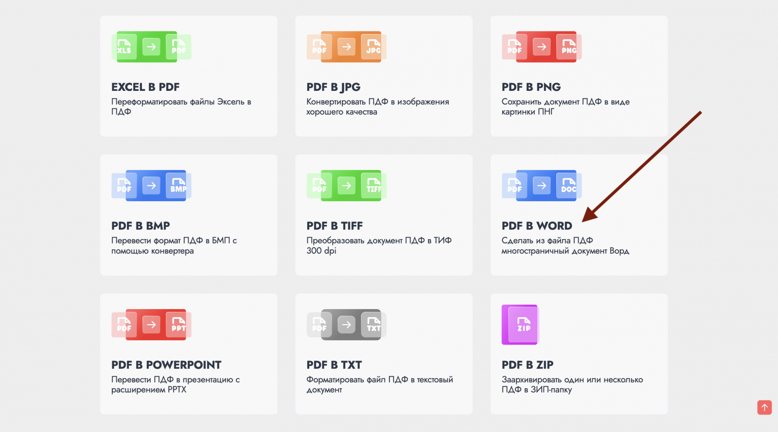 Шаг 1. На главной странице сайта выбираем пункт «PDF в Word»: