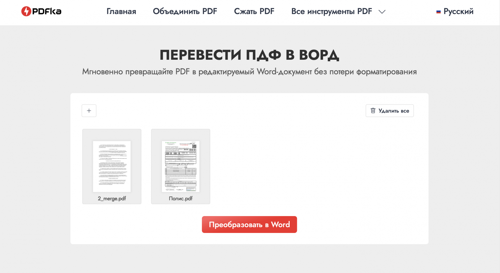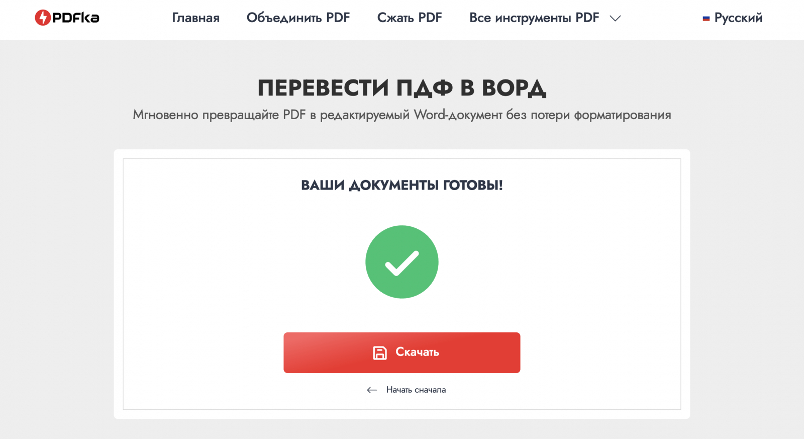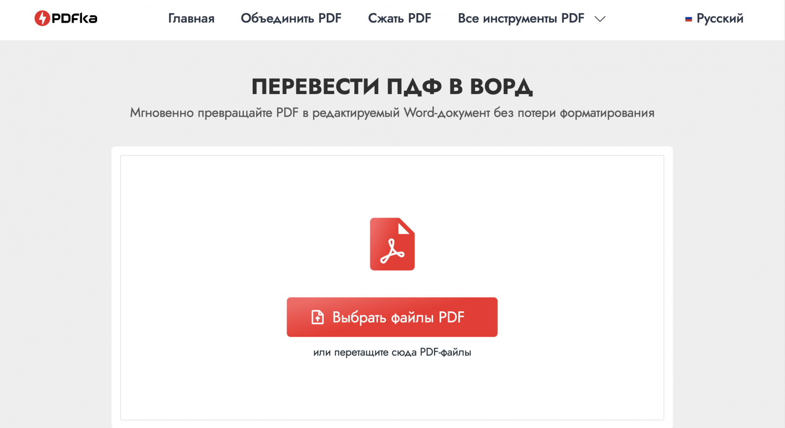 Самый простой вариант. Устанавливать программы, регистрироваться на сайте и разбираться в сложных настройках не придется. Просто загружаете файл и через несколько секунд получаете документ в формате DOC или DOCX. Давайте посмотрим, как это работает, на примере сервиса PDFka.