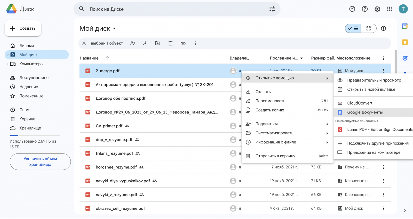 Этот способ выручит, если нужно не просто перевести PDF в Word, а сразу приступить к работе с текстом. В Google Docs можно комментировать фрагменты, обсуждать правки с коллегой и вносить изменения — хоть с телефона в метро, хоть с ноутбука в кафе. Ниже — инструкция, как превратить ПДФ в редактируемый документ.