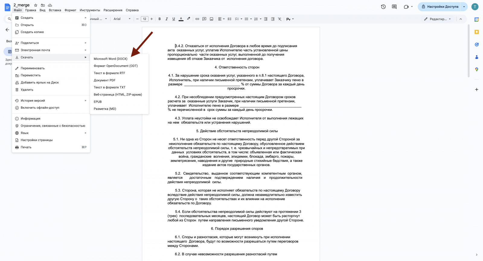 Шаг 3. Вносим правки в документ. Затем заходим в главное меню, выбираем «Скачать» → «Microsoft Word (DOCX)»: