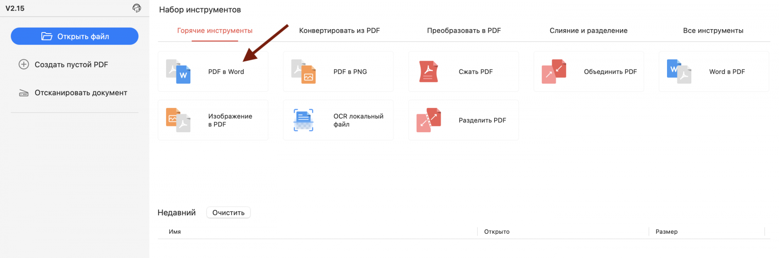 Шаг 1. Заранее скачиваем программу. Открываем. Выбираем блок «PDF в Word»: