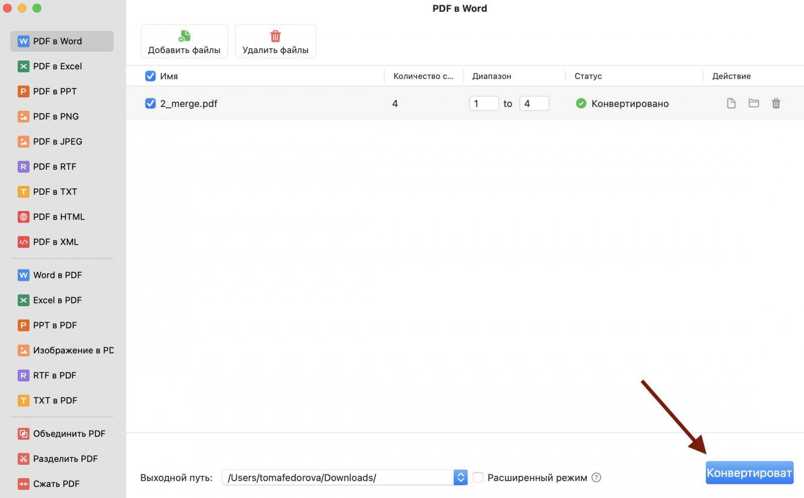 Шаг 2. Добавляем файл и нажимаем «Конвертировать». После обработки документ автоматически появится в папке «Загрузки» на вашем ПК или ноутбуке: