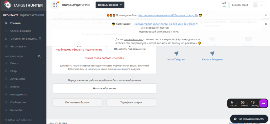 TargerHunter — сервис отслеживает Одноклассники и ВКонтакте. В нем собрано множество функций для поиска и аналитики аудитории. Всего можно насчитать около 150 инструментов. Вот самые интересные из них: