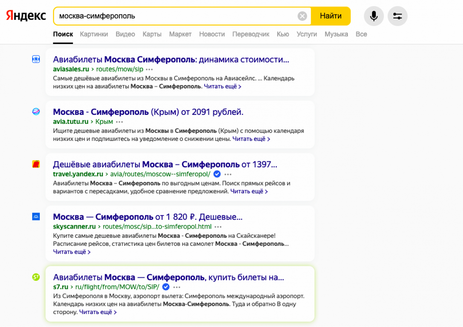 S7 Airlines успешно конкурируют с популярными агрегаторами в поисковой выдаче — компания входит в топ–5 по запросам направлений. Например, в Яндексе по запросу «Москва — Симферополь» компания выводится первой после Aviasales и других подобных сервисов.