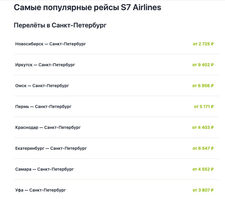 На страницы рейсов мы добавили ссылки на страницы направлений, чтобы вписать их в общую структуру сайта. Например, на странице рейса S7–1005 мы добавили блок с популярными направлениями полётов из разных городов в Санкт-Петербург
