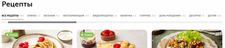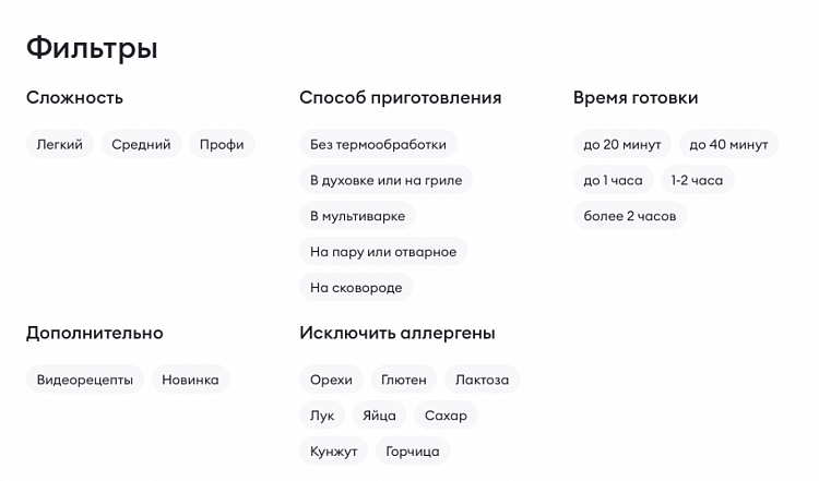 В новом разделе читатель может найти рецепт не только по категории самого блюда, но и по параметрам его приготовления. Механика с фильтрами — ещё одна витрина рецептов и дополнительная точка входа для читателя.