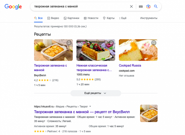 Помогли получить расширенные сниппеты и увеличить долю присутствия в галерее рецептов Google. Рецепты — конкурентная тема в поиске. Наибольшее внимание и переходы получают те ссылки, которые видны в галерее рецептов и имеют расширенные сниппеты. В таких сниппетах кроме стандартного описания видны и разные элементы, например, рейтинг рецепта, количество голосов и время приготовления.