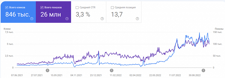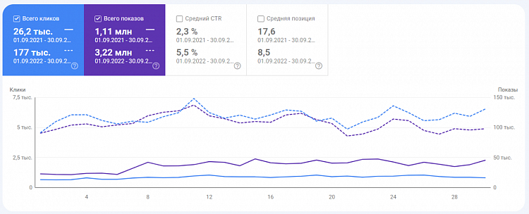 увеличился суммарный поисковый трафик на статьи, рецепты и новости с марта по сентябрь 2022 г.