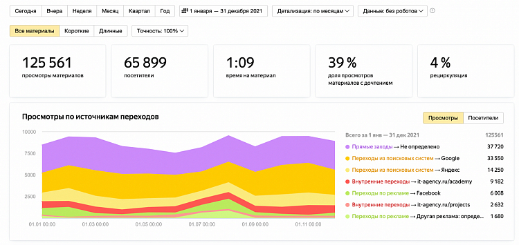 Новая стратегия предусматривала обязательный анализ метрик. У нас появилось два отчёта — с редакционными метриками и отчёт, объединяющий органику и платную дистрибуцию.