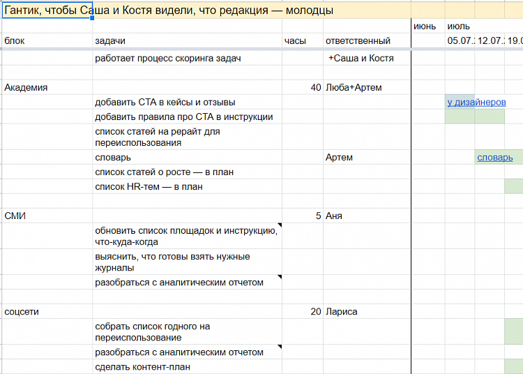 Назначили ответственных за площадки. У сотрудников, которые отвечают за выпуск контента, KPI обозначен в количестве, а у главреда ― в качестве. Они друг друга балансируют: первые следят за сроками и ограничивают итерации в тексте, а второй доводит текст до ума и сводит с «Тоном и голосом», принятым в агентстве.