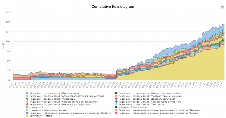 Стали лучше контролировать процессы. Чтобы выпуск не тормозился, мы установили лимиты по времени и максимально возможному количеству материалов на каждом этапе редакционного процесса. Лимит на время помог увидеть задачи, которые долго стоят в одном статусе. Ответственный за выпуск точечно приходил к автору материала и решал проблему индивидуально. А лимит на количество материалов показывал этапы, на которых материалы застревают чаще всего. Здесь ответственный изучал причины и чинил процессы.