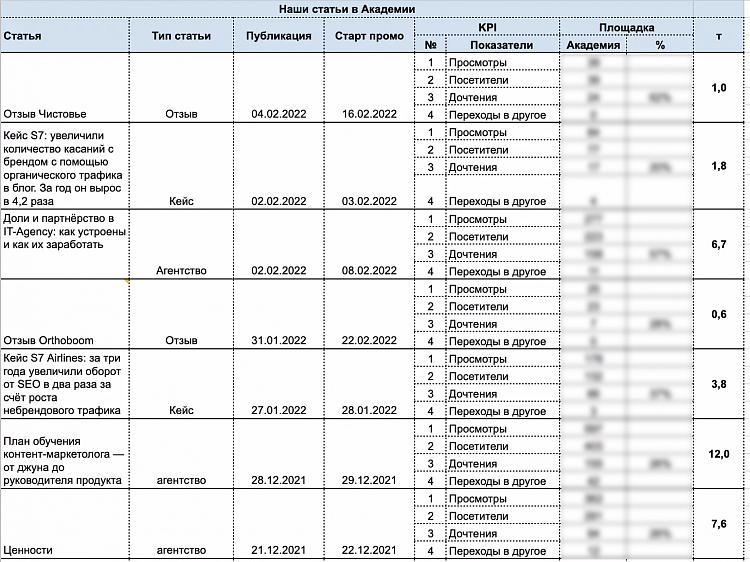 Собрали аналитику для улучшения качества контента и его дистрибуции. Во время перестройки агентства мы перестали следить за метриками, просто шли по выработанному процессу: писали кейсы и отзывы, размещали их в Академии, а затем включали рекламу. Некоторые материалы попадали в соцсети и рассылку, но несистематично. Это привело к тому, что через некоторое время мы выжгли доступные каналы.