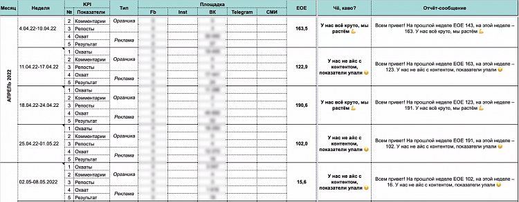 Отчёт EOE мы доработали под себя: наш метрика объединяет «органику» и платную дистрибуцию. Он позволяет понять, насколько аудитории понравились конкретные темы, форматы и какое количество постов нужно написать и прорекламировать. Например, в апреле люди больше реагировали на вебинары, чем консультации от наших экспертов.