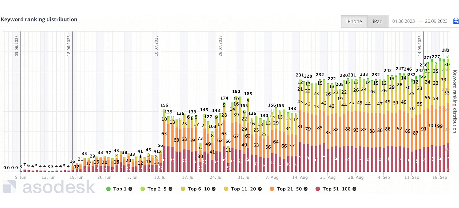 Когда мы приступили к работе с приложением на iOS, его только запустили. Объём ядра состоял из трёх ключей, а скачиваний практически не было. Спустя две недели после релиза приложения, мы добавили ключевые запросы в заголовок, подзаголовок, а также в невидимое поле метаданных. В результате объём ядра вырос в 10 раз.