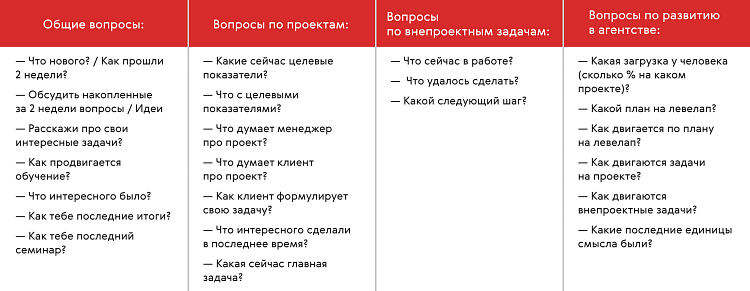 «Встречи один на один нужны не только для обсуждения рабочих моментов. Часто мы используем планёрку, чтобы просто поболтать, спросить, как дела, дать какой-то совет, например, как решить какой-то вопрос с клиентом, брать проект или нет. Т. е. мы обсуждаем любые вопросы, которые возникают.