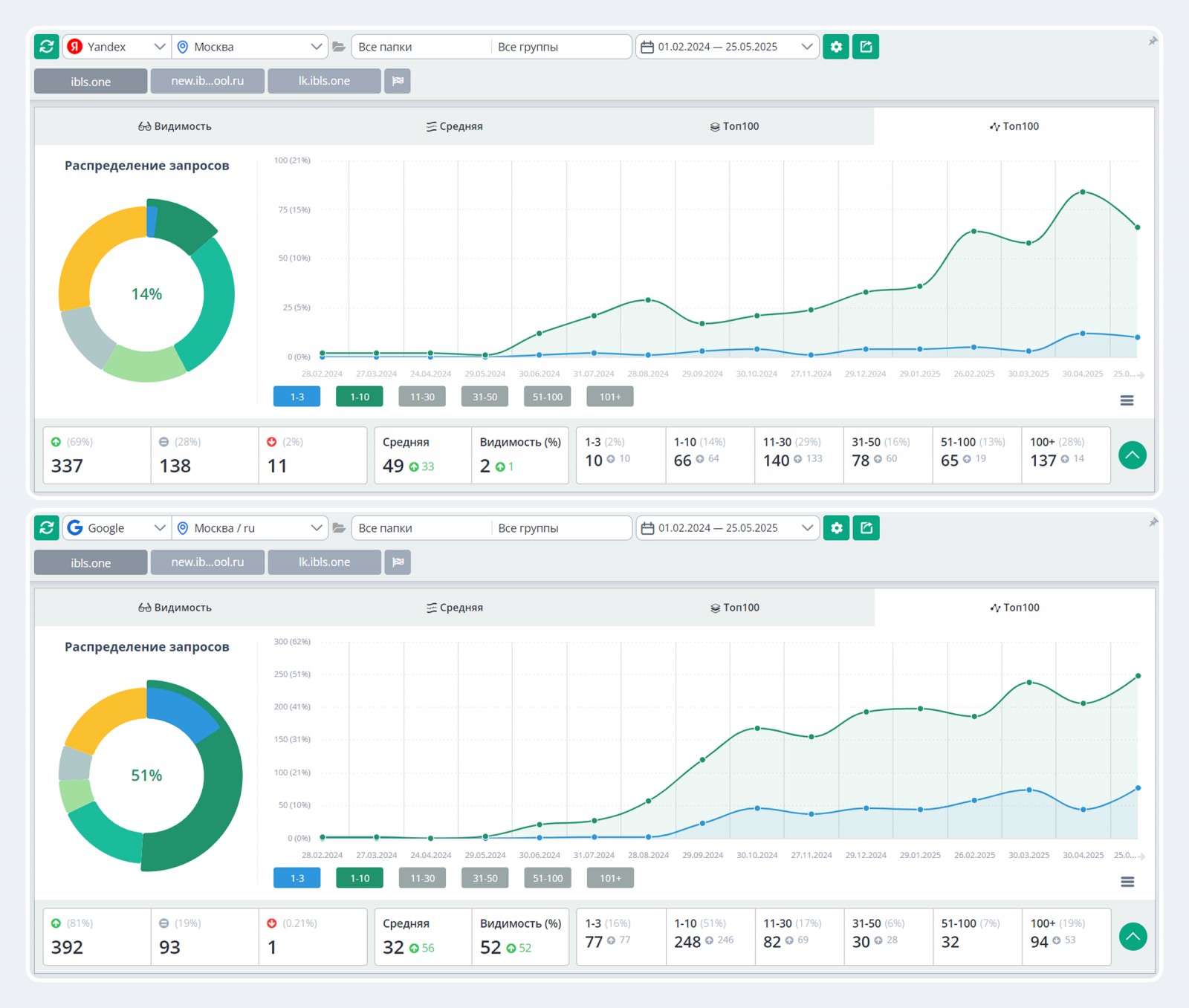По брендовым запросам на первое место вышел основной сайт ibls.one, личный кабинет lk.ibls.one занял вторую позицию, а по запросам про личный кабинет — первую.