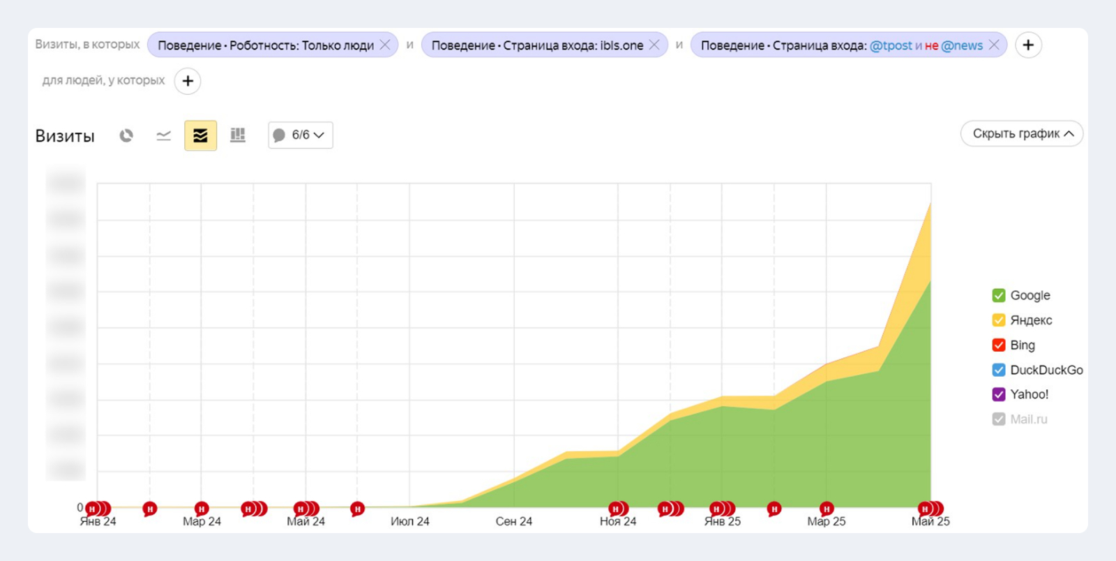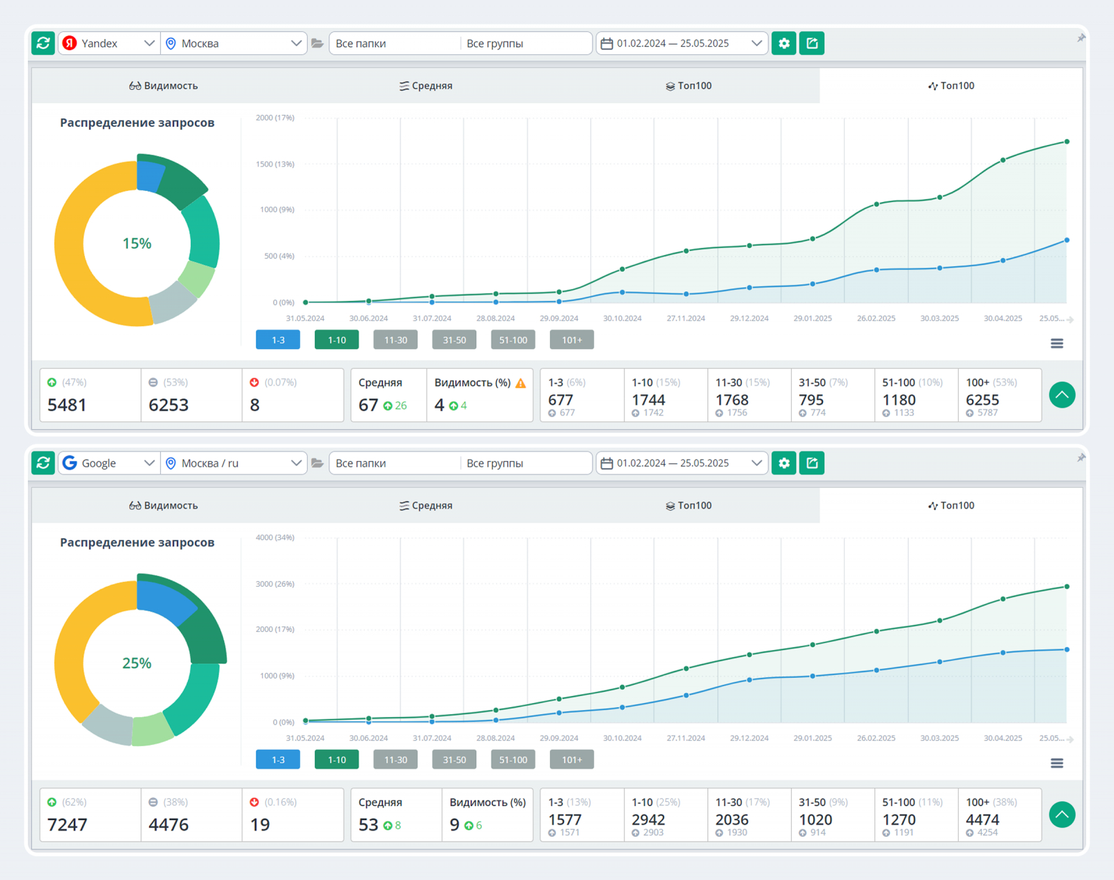 То же самое и с информационными запросами, где стартовали с нуля. На момент написания материала выросли в Яндексе до 15%, а в Google до 25%: