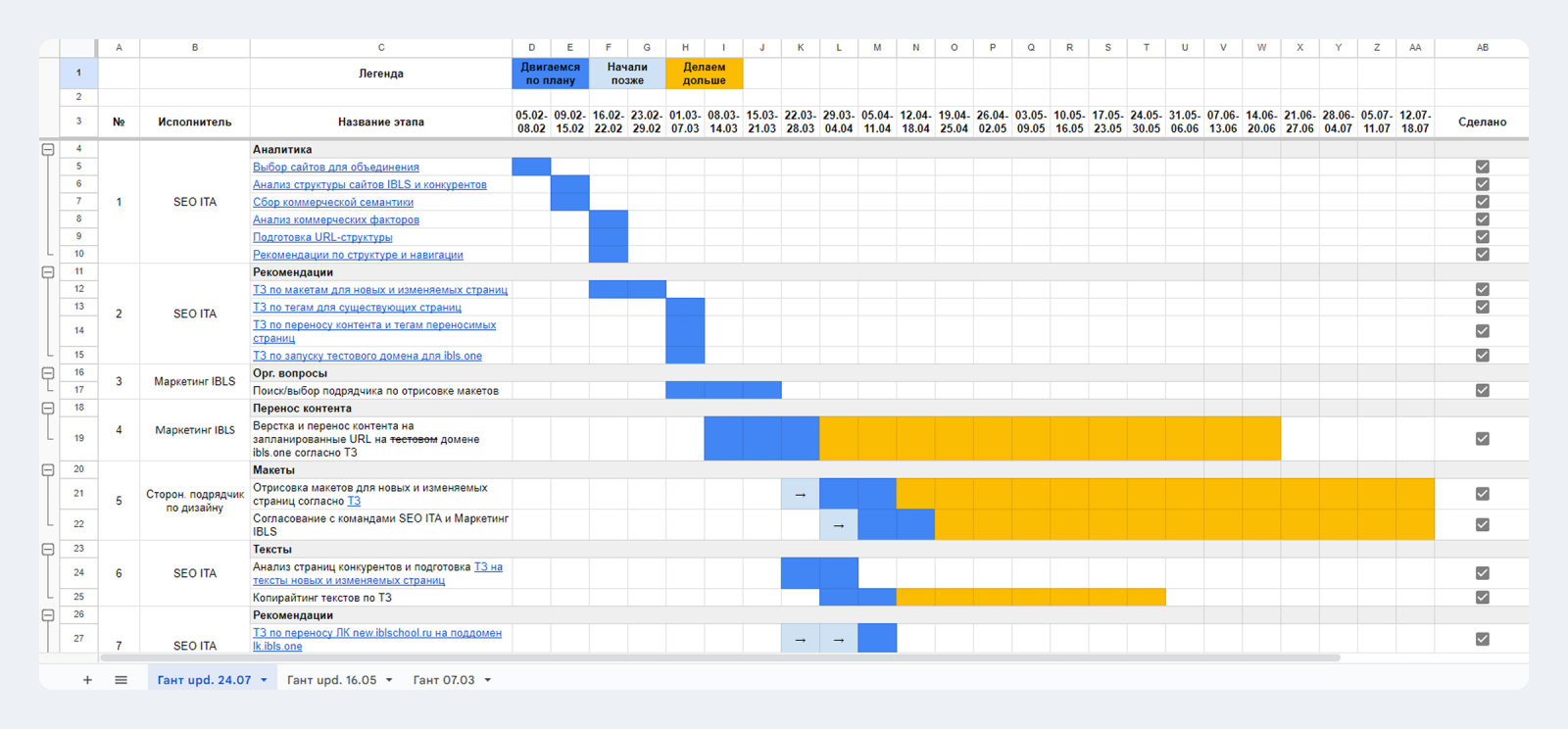 Чтобы чётко следовать графику, составили подробный Гант по редизайну сайта.