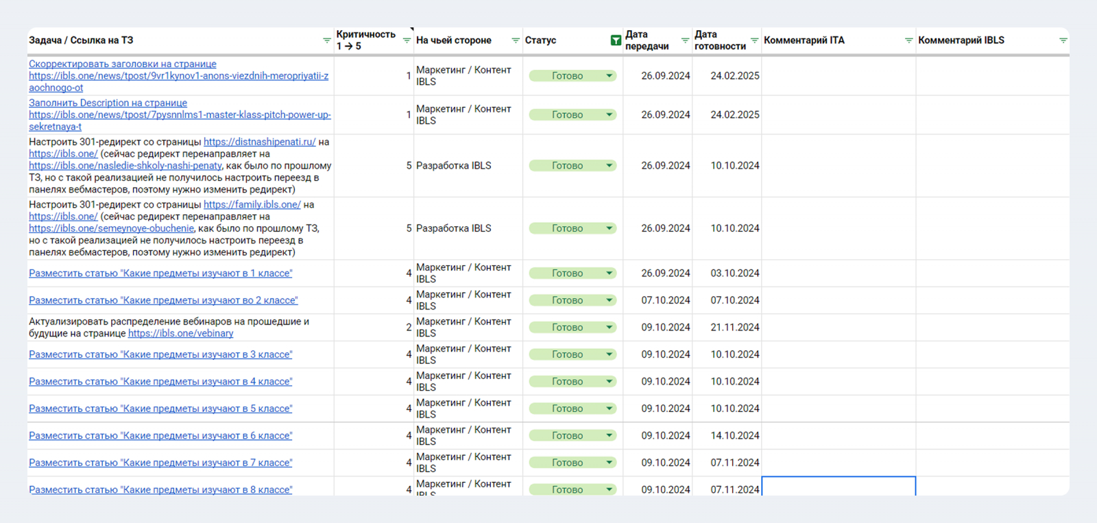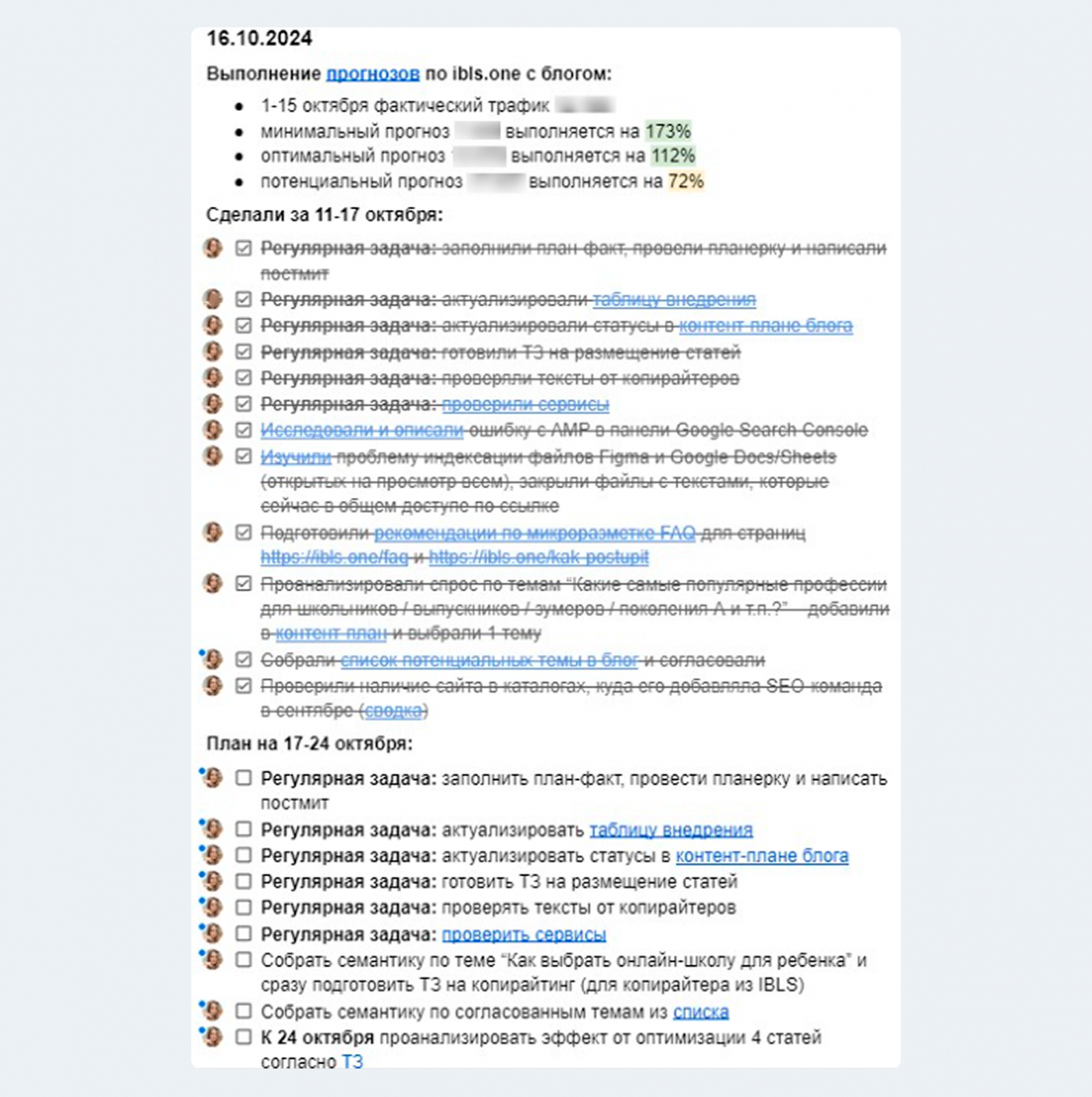Ещё раз про проектный менеджмент со стороны IT-Agency. Все планы и факты фиксировали в отдельном документе, в том числе выполнение прогнозов по трафику и выход материалов.