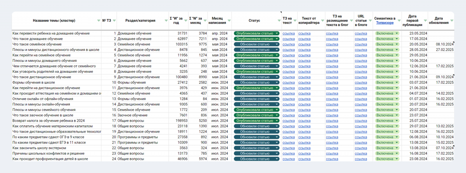 Блог уверенно растет в трафике, статьи занимают позиции в топ-10 и топ-3 в поисковых системах, контент приносит лиды. Последнее спрятано в CRM клиента под NDA, точных цифр сказать не можем. Но в конце статьи дадим ссылку на шаблон контент-плана.