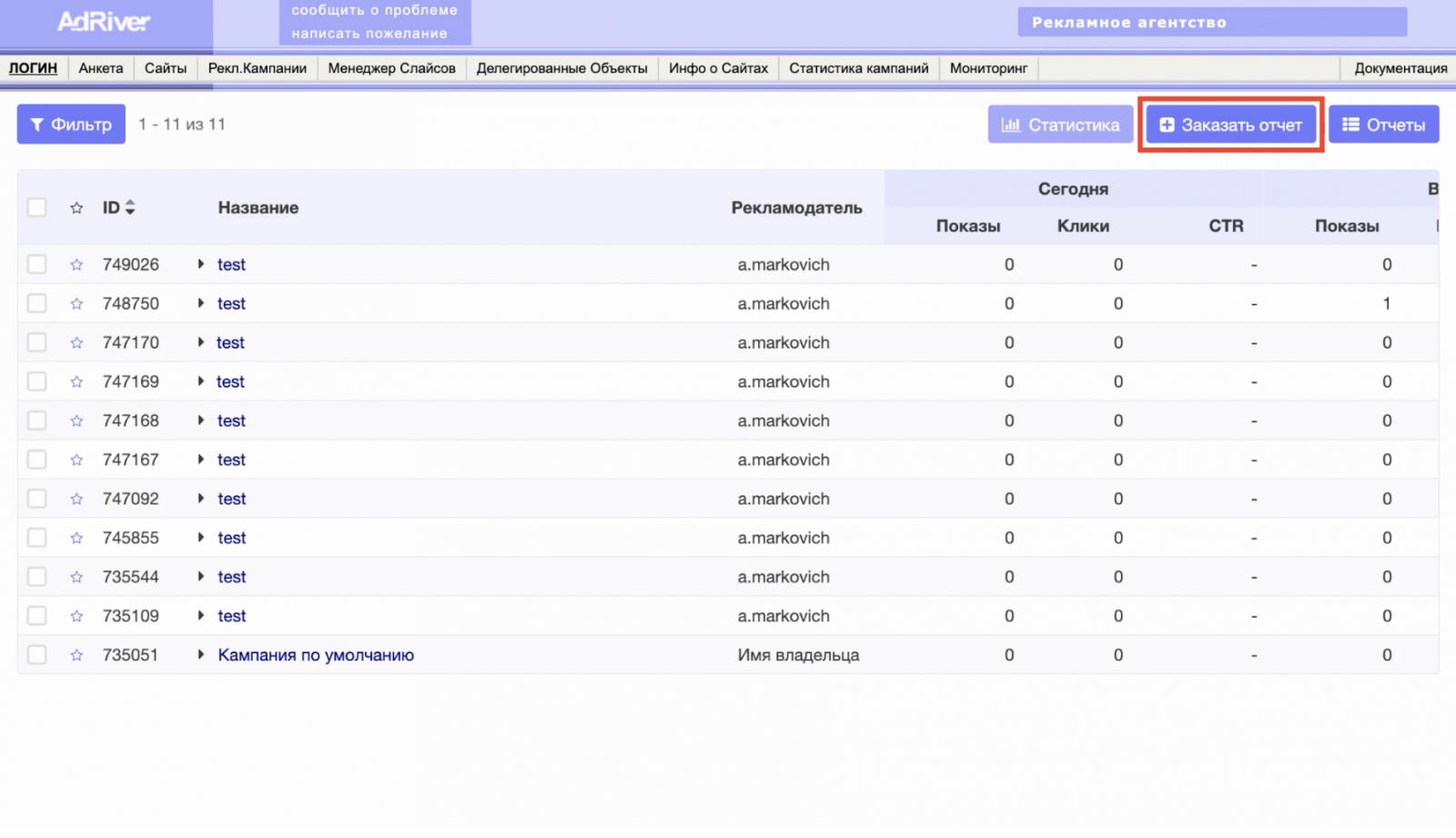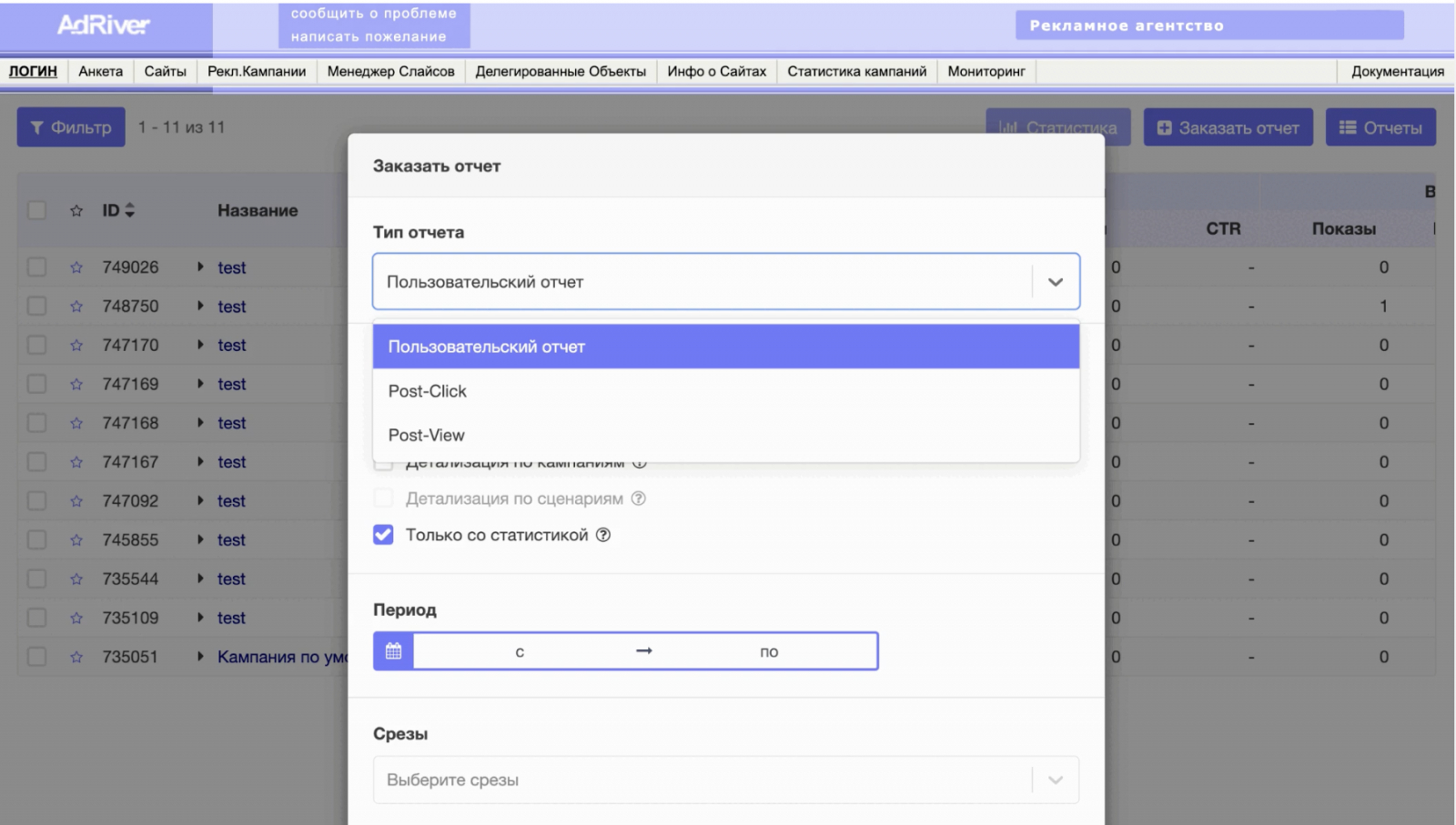 Самые базовые из отчетов, а именно «Post-view», «Post-click» и «Пользовательский» выгружаются в интерфейсе. Делается это в разделе «Статистика Кампаний» → затем нужно нажать на кнопку «Заказать отчет» → тут появляется возможность выбрать конкретный тип отчета. Базово, в этой же вкладке можно посмотреть и пересечение с определенными ограничениями.