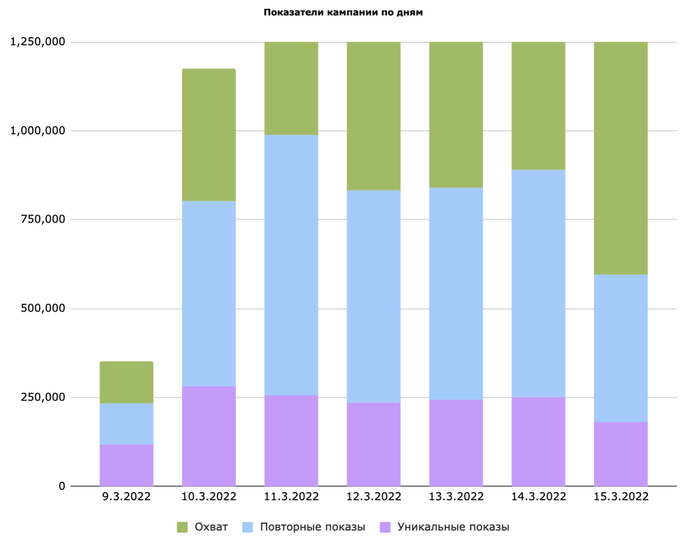 А вот для того, чтобы заказать более развернутые отчеты, в том числе и по пересечениям площадок, обращаться нужно напрямую к личному менеджеру AdRiver. Следует отправить ему письмо с запросом «Стандартного базового медиаотчета», указать необходимые даты и названия кампаний, и получить подобный красивый график: