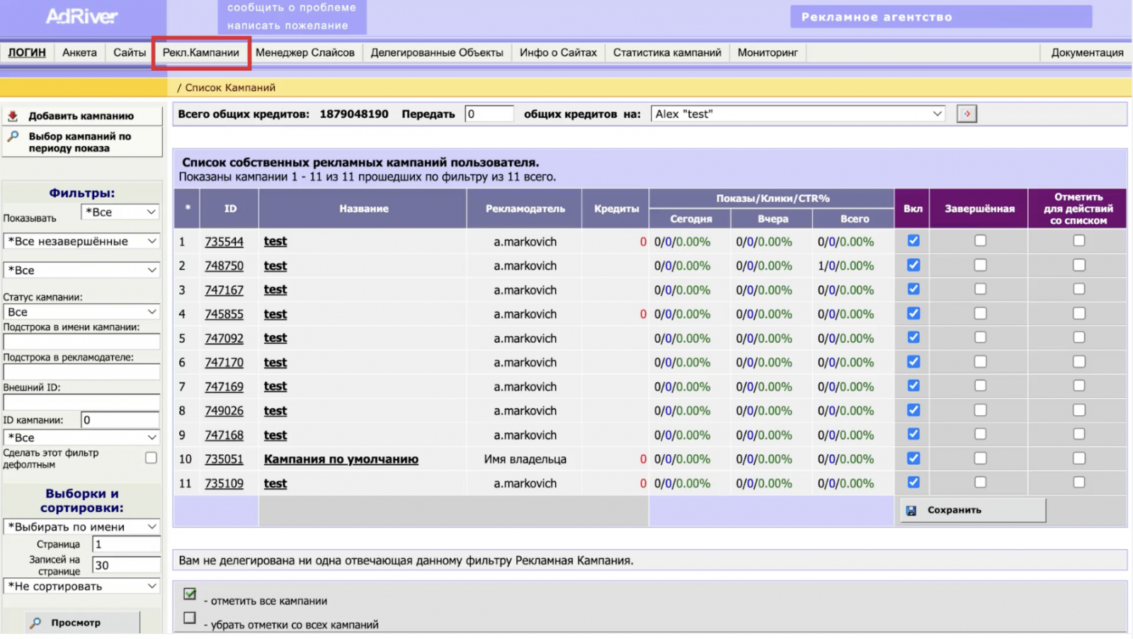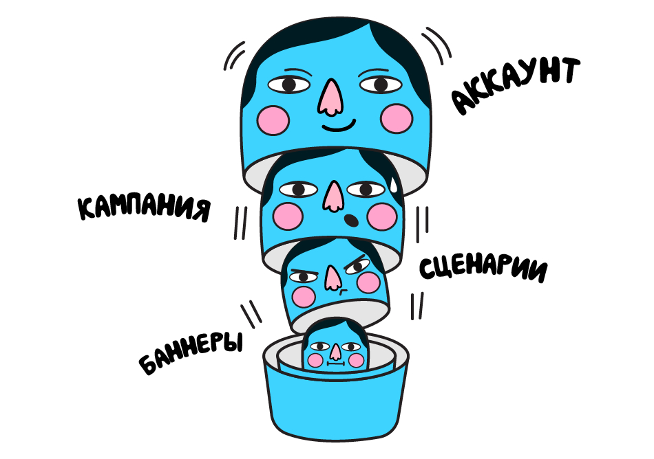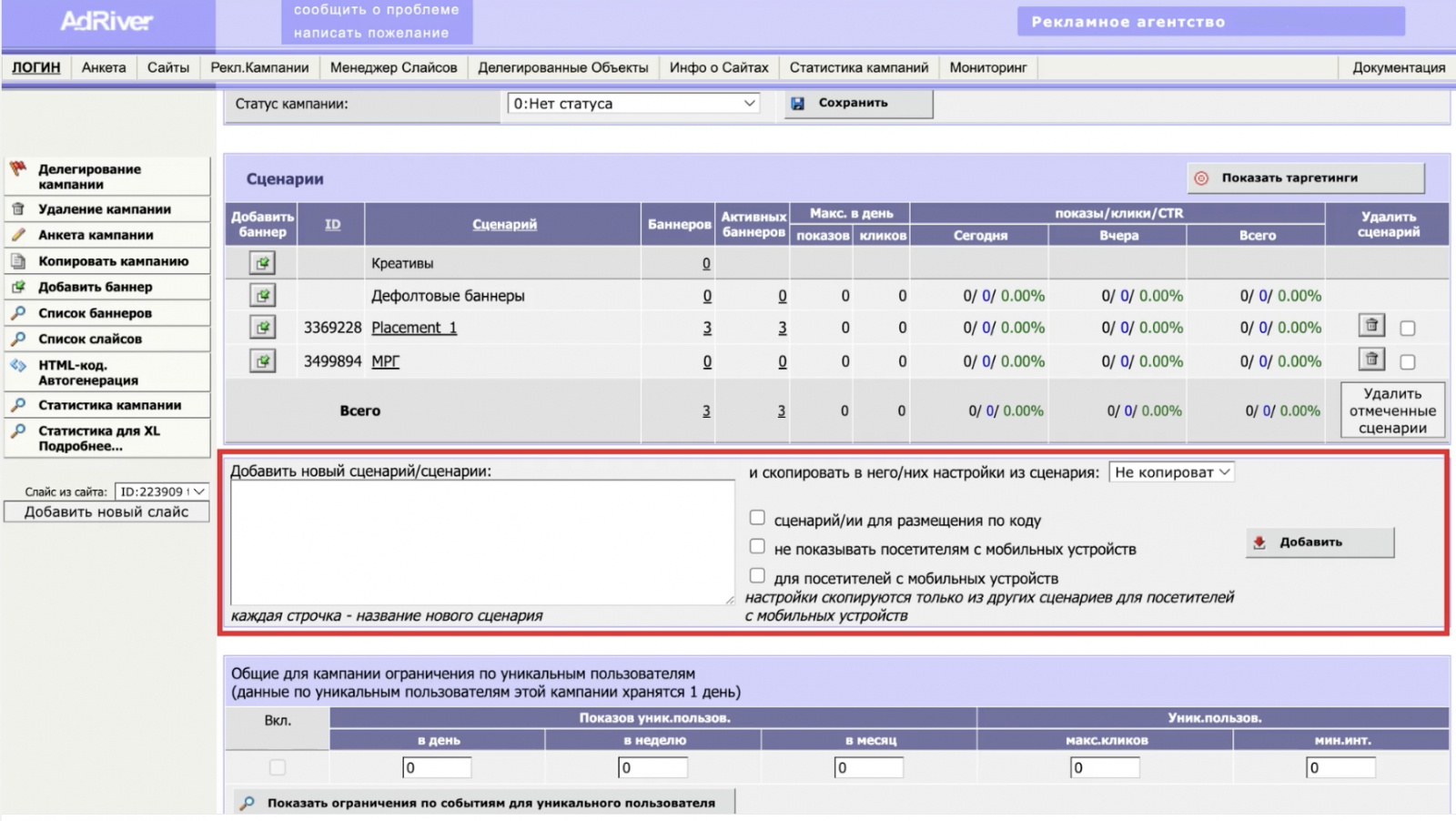 Ответ на этот вопрос задевает тему структуры кабинета AdRiver, которая напоминает матрешку. Внутри вашего аккаунта, высшей сущности, заводятся рекламные кампании, в пределах которых уже и создаются сценарии. Сценарий, в свою очередь, может содержать любое количество баннеров с заданными настройками и комментариями (что позволяет удобно делить ресайзы или тематику креативов).