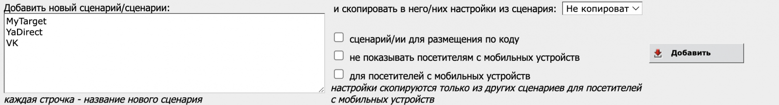 Далее нужно создать столько сценариев, сколько площадок охватывает рекламная кампания, и назвать их соответствующе. Например, если в медиаплане прописано размещение на трех площадках, а именно MyTarget, YaDirect и VK, то и сценарии нужно назвать так, чтобы было понятно, что статистика будет идти именно с этих площадок.