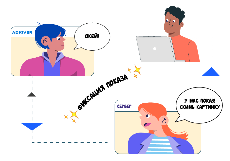 Для тега на показ все работает немного сложнее. Чтобы прометить показы можно либо хранить креатив на стороне адривера, либо использовать пиксель. Механика работы в обоих случаях идентична, отличается только тот материал, который будет подгружаться с сервера. Далее разберу именно сценарий прометки пикселем. Итак, тег пикселя прописывается в поле для стороннего аудита на площадке. Этот тег представляет собой ссылку на исходник, который хранится на сервере AdRiver. Когда происходит показ, этот пиксель призывается вместе с рекламным материалом, то есть система стучится на сервер AdRiver и просит дать картинку, именно в этот момент и фиксируется показ.