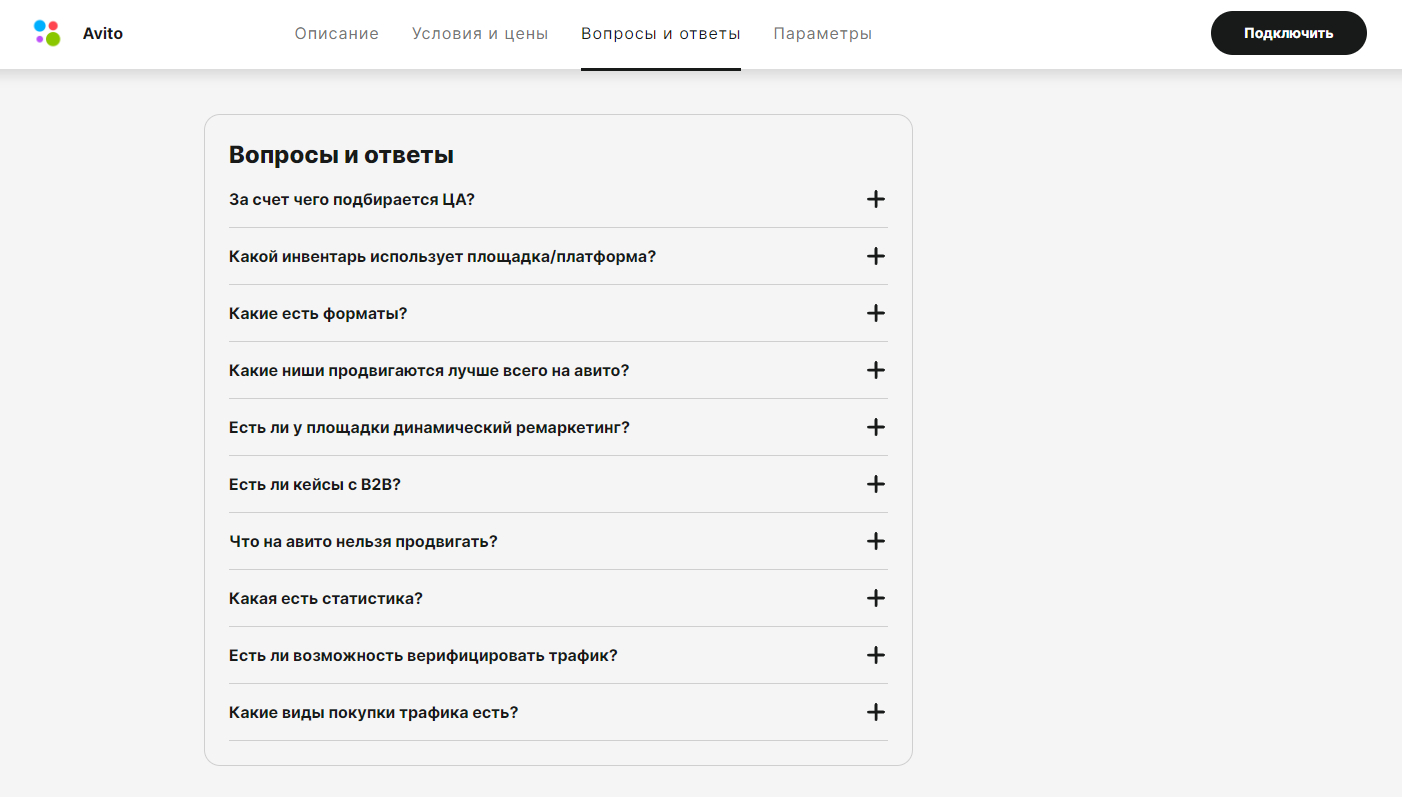 Крупнейший Q&A по рекламным площадкам в России. Наша команда проделала большую работу: мы проанализировали рынок, пообщались с клиентами и собрали самые частые вопросы по каждой площадке. Чтобы собрать информацию, смотрели медиакиты и писали площадкам напрямую. В итоге получилось 1800 содержательных ответов — сейчас их можно найти в карточках площадок.