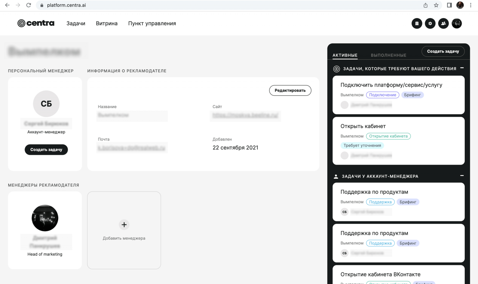 Иногда клиентам Centra требуется рекламная площадка, которой у нас нет. В таком случае мы подключаем новые продукты в индивидуальном порядке. В Centra можно оставить запрос персональному менеджеру: мы договоримся с площадкой о партнерстве, и у клиента появится доступ к ней через 1–2 дня.