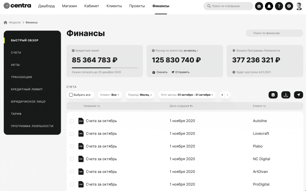 В Centra достаточно принять один договор-оферту, чтобы получить доступ ко всем площадкам. Платежи по рекламным кампаниям проходят через один расчетный счет, а все документы хранятся в едином личном кабинете. Вот как выглядит личный кабинет на платформе Centra ↓
