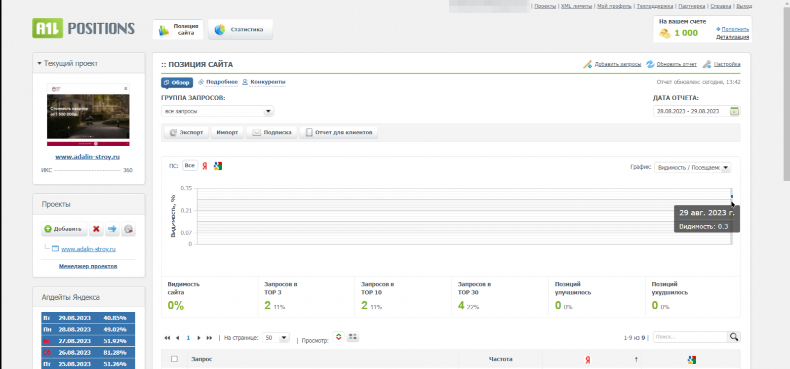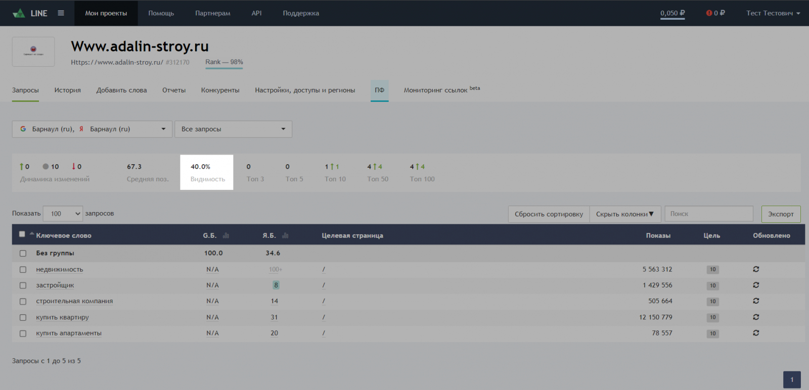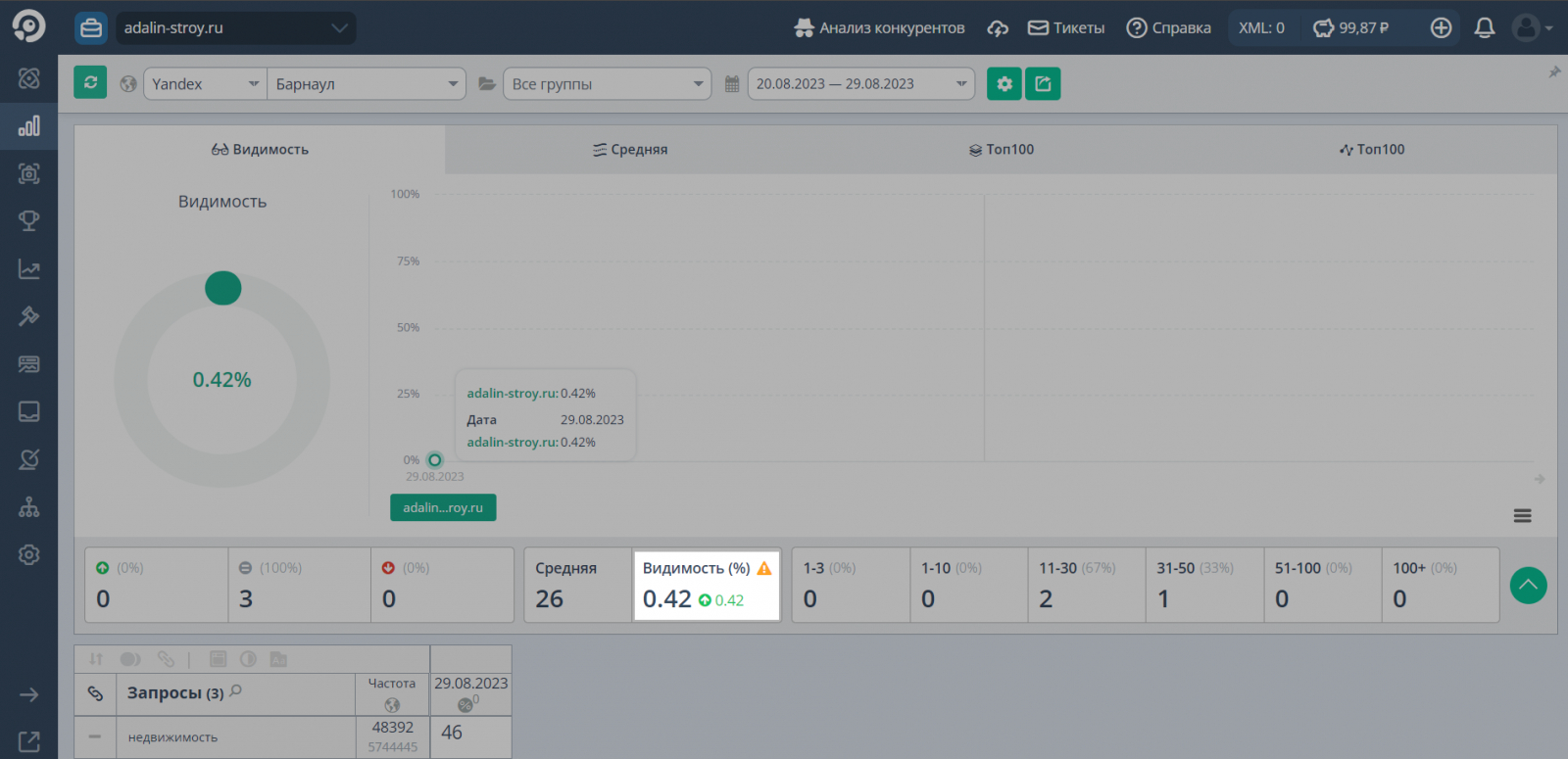 Мой пример, конечно, не показывает полной картины, он дан скорее для понимания расчетов. Не стоит забывать и о том, что на видимость будут влиять и другие метрики — например, процент запросов в топ-10 и средняя позиция, которые вы можете найти в инструментах.